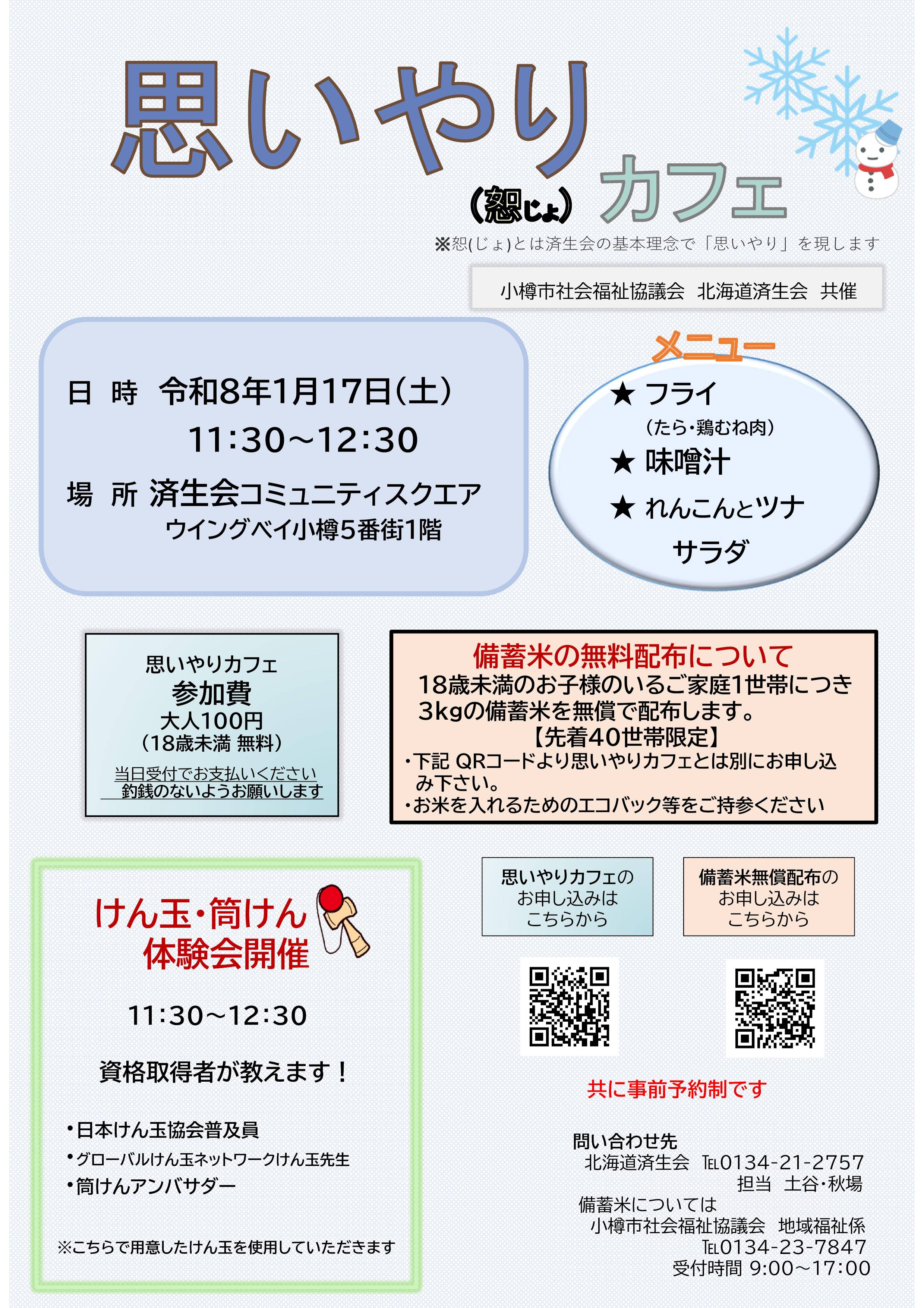 小樽市社会福祉協議会では、1月17日(土)に北海道済生会と共催で「思いやりカフェ」を開催いたします。