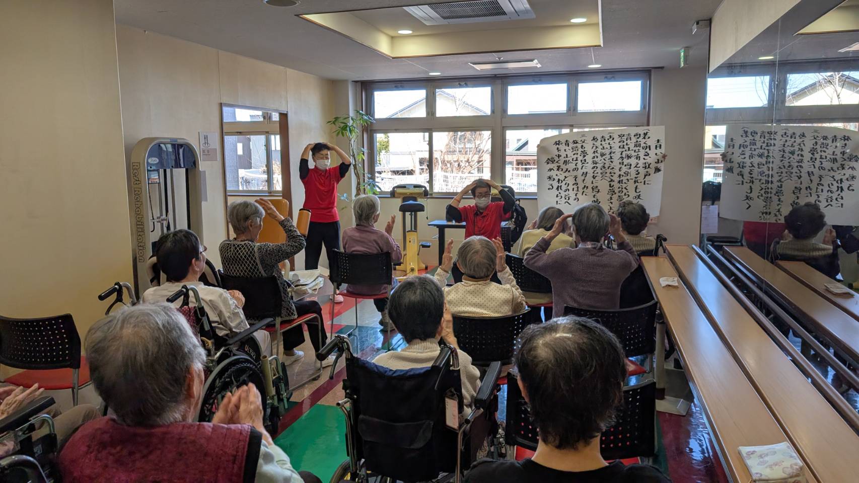 4月16日 和楽路は ラ・ナシカさんに 4月度の訪問をさせて頂きました(´V`)♪鉄道唱歌で健康体操、青い山脈で脳トレ体操、懐かしい歌謡曲等々皆さんと歌いました。恒例の 反応拍手(お買い物拍手)では、今回も、大笑い🤣 でした。